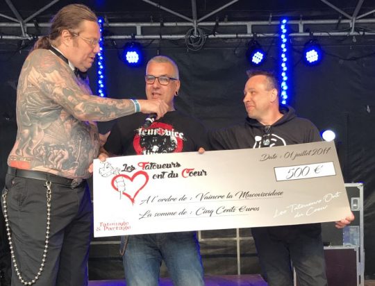 Mais l’événement marquant du Cantal Ink 2017 reste, pour nous, la remise d’un chèque de 500 € de notre part à une association de lutte contre la mucoviscidose chez les enfants. C’est le tatoueur Gomette, ambassadeur de l’organisation baptisée Vaincre la mucoviscidose, qui est venu récupérer le don sur la grande scène du Cantal Ink – une somme récoltée grâce à votre générosité. Le parfait point d’orgue à un parfait festival… en attendant le Corsair Tattoo Ink, autre événement partenaire de notre association prévu du 8 au 9 juillet à Saint-Malo.